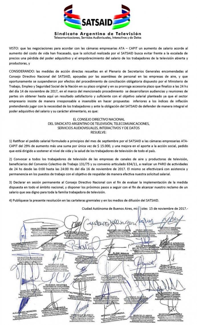 A partir de esta situación, el Consejo Directivo Nacional del Satsaid decidió convocar un paro de actividades de 24 horas. Será desde las 0 hasta las 24 del 16 de noviembre de 2017 y comprenderá a los trabajadores de televisión de las empresas de canales de aire y productoras de televisión .