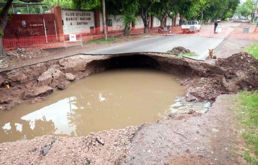 El pozo está desde el sábado en las inmediaciones del Club Banco Nación. Por el momento, el agua está cortada en la zona y el tránsito interrumpido. Personal de Aguas Mendocinas está trabajando en el lugar.