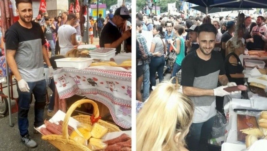 Maximiliano Gómez (26) aprovechó el acto en Plaza de Mayo por el 24 de marzo y junto a la familia de su novia colocaron un gazebo para vender gran cantidad de sándwiches de salame cordobés y queso, en enormes flautas.