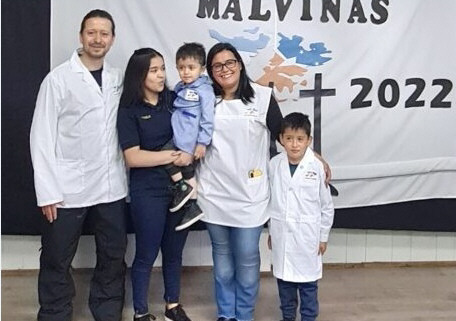Soledad Otaola, docente, y su esposo Denis Barrios, profesor de Educación Física, arribaron con sus tres hijos más chicos. Llegaron a la base Esperanza junto a las otras ocho familias de la dotación 2022 después de una travesía que los llevó a salir de su hogar en Río Grande el 7 marzo por la madrugada para volar a Ushuaia desde donde lo hicieron a Buenos Aires para cumplir con testeos PCR en la guarnición de Campo de Mayo antes de subirse al Hércules C-130 que los llevó hasta la base Marambio.