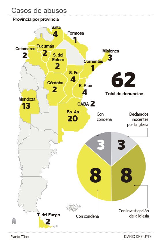 El caso de Grassi, condenado en 2009 por abuso sexual agravado a uno de los chicos a los que debía cuidar en la Fundación Felices Los Niños, funcionó como disparador. Hasta entonces, sólo se habían conocido nueve hechos de abuso sexual por parte de curas. En la Argentina no hay registros oficiales sobre la cantidad de sacerdotes o monjas denunciados y mucho menos sobre cuántas son sus víctimas. En base a las noticias, los informes de corresponsales de la agencia y la información que aportaron fuentes propias, Télam reconstruyó un mapa de la pedofilia dentro de la Iglesia utilizando el mismo mecanismo de La Casa del Encuentro, la ONG que lleva adelante el único registro nacional que existe sobre femicidio.