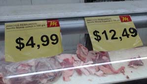 El mismo lugar exhibe en números grandes los 100 gramos de puchero económico a 4,99 pesos, casi 50 pesos el kilo, mientras que sin mostrar los precios el kilo de costilla de novillito, el asado más deseado, oscila entre 115 a 123 pesos. Se trata de una estrategia comercial de grandes cadenas de supermercados que operan en la capital de Corrientes, mientras que en carnicerías más chicas el precio del asado se ubica entre 105 y 115 pesos en el centro de la ciudad y en los barrios más alejados se consigue a costos que van desde los 85 a los 98 pesos.