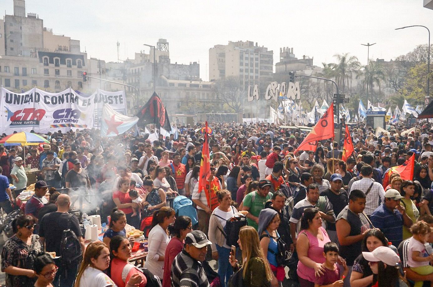 Al acto asistieron miembros de La Cámpora y otras agrupaciones kirchneristas. La marcha también contó con la participación del poderoso sindicato de Camioneros, liderado por Hugo Moyano. Pablo Moyano, secretario adjunto de Camioneros e hijo de Hugo, no habló durante el acto pero sí lo hizo con los periodistas una vez finalizado. Y apuntó contra el viaje del Presidente a Nueva York. "Nos llama la atención que haya largado su reelección en EEUU con Donald Trump y el Fondo Monetario Internacional (FMI). Esperemos que alguna vez (Macri) escuche al pueblo argentino. Sólo escucha a los empresarios".