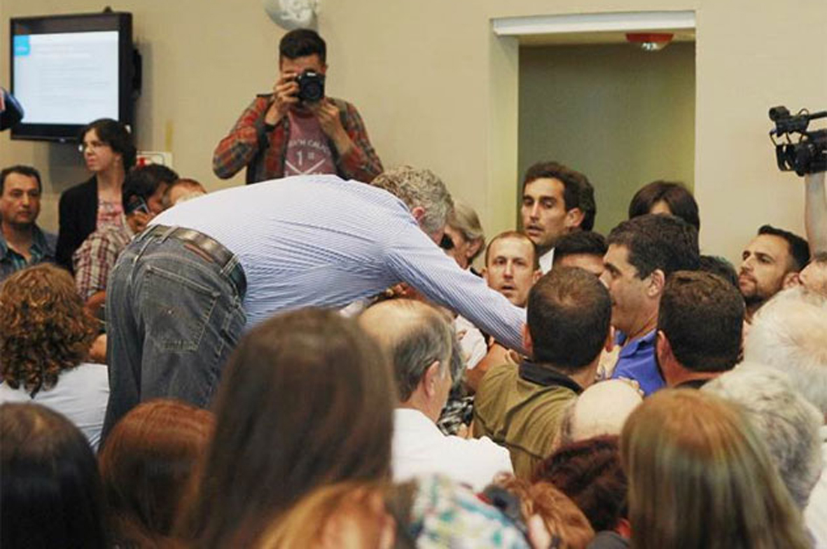 En ese contexto, el titular del bloque del Frente para la Victoria, diputado Agustín Rossi, intentó separar a los grupos en conflicto, a los gritos y trepado a una mesa. Fue una imagen impactante e inesperada hasta para periodistas y reporteros gráficos. En tanto, en el interior de la sala donde se realizó el plenario, diputados del Frente para la Victoria-PJ y de otros bloques opositores abucheaban al ministro Triaca y a diputados oficialistas.