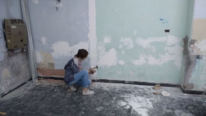 El aula 1 -la más grande del edificio que fue construido en Flores a finales del siglo XIX- fue la que más trabajo dio: "Se le hizo revoque, se sacó la pintura vieja con espátulas y lijas, y la volvimos a pintar, además de pintar el pizarrón y limpiar mesas y sillas", describe Catalina, alumna de 5° año de la escuela técnica orientada al Diseño.