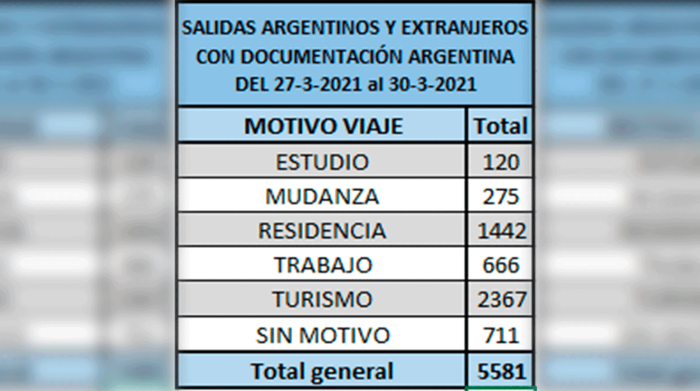 Pese a toda esta serie de medidas para desalentar la salida de argentinos, de acuerdo a registros oficiales a los que accedió este medio, en esos tres días de marzo salieron del país 5581 personas. De ese total, 120 lo hicieron por estudio; 275 por mudanza; 1442 regresaron a sus países de residencia; 666 por trabajo; 711 sin motivo y 2367 por turismo.