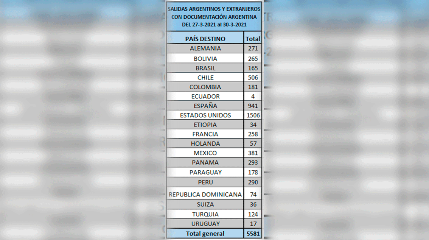 Desde el 1 de diciembre de 2020 hasta el 29 de marzo, el destino turístico más elegido por los argentinos fue los Estados Unidos. En ese período unas 9.356 personas visitaron ese país, seguido por Chile, a donde se dirigieron 5.383 argentinos. Panamá recibió 3.715 mientras que España 3.144 ciudadanos.