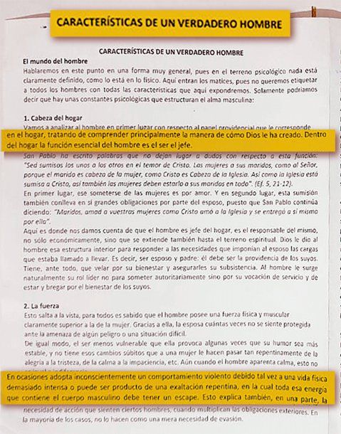En el mismo apunte se habla del hombre como "cabeza del hogar", donde la función esencial es "ser el jefe". Además se habla del hombre como responsable de la casa "no sólo económicamente" sino también en el plano espiritual.