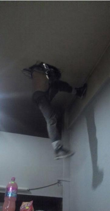 Con la anuencia de la dueña del local, personal de bomberos subió a la azotea y descubrió que había una claraboya forzada y en el interior se encontraba un joven atrapado con más de medio cuerpo colgando hacia adentro del local.