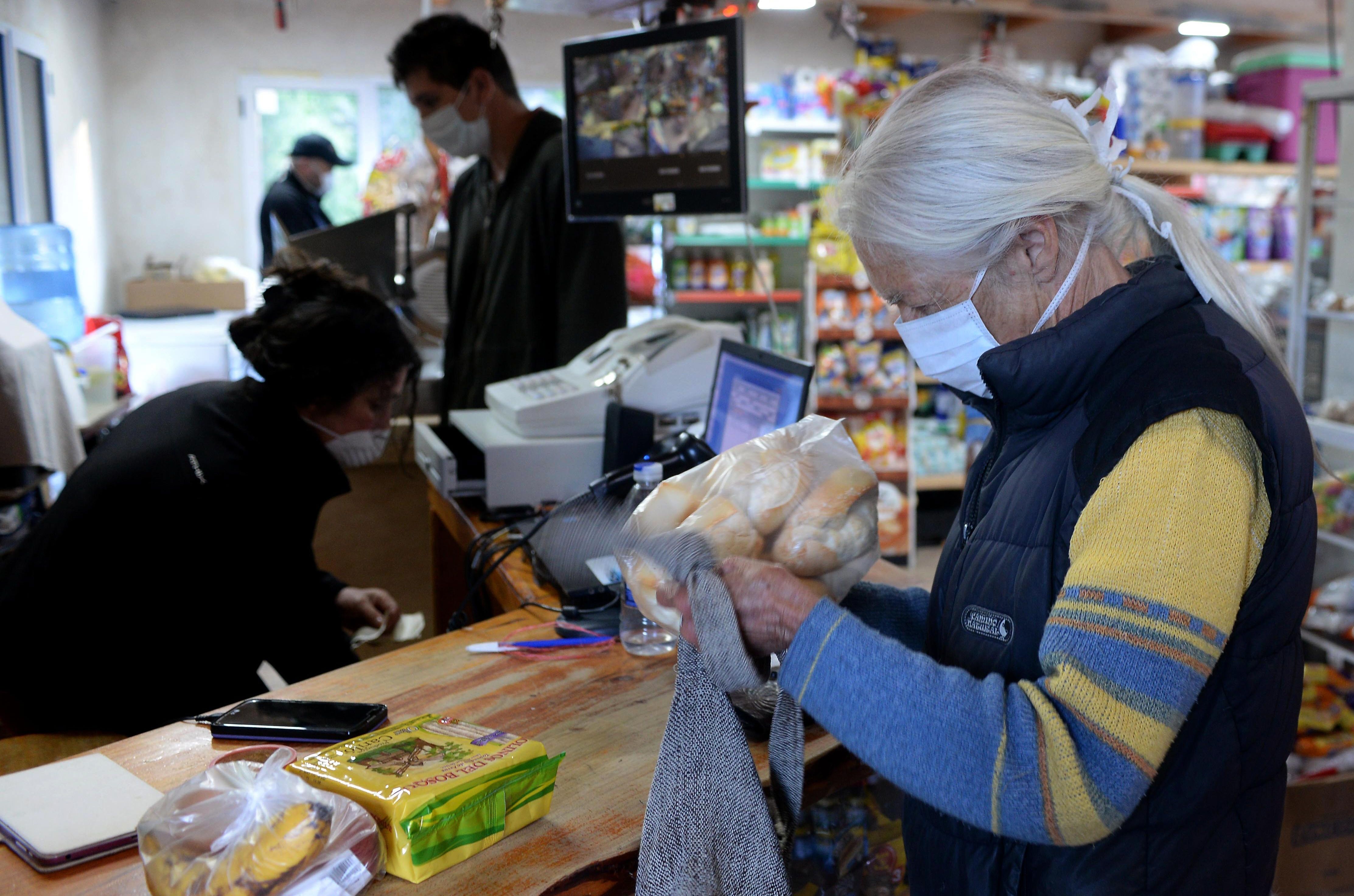 Barbijos para todos. En un almacén de Epuyén se puede ver el pánico de los vecinos que para salir a la calle se protegen con barbijos. La barrera sanitaria no ha logrado detener los contagios.