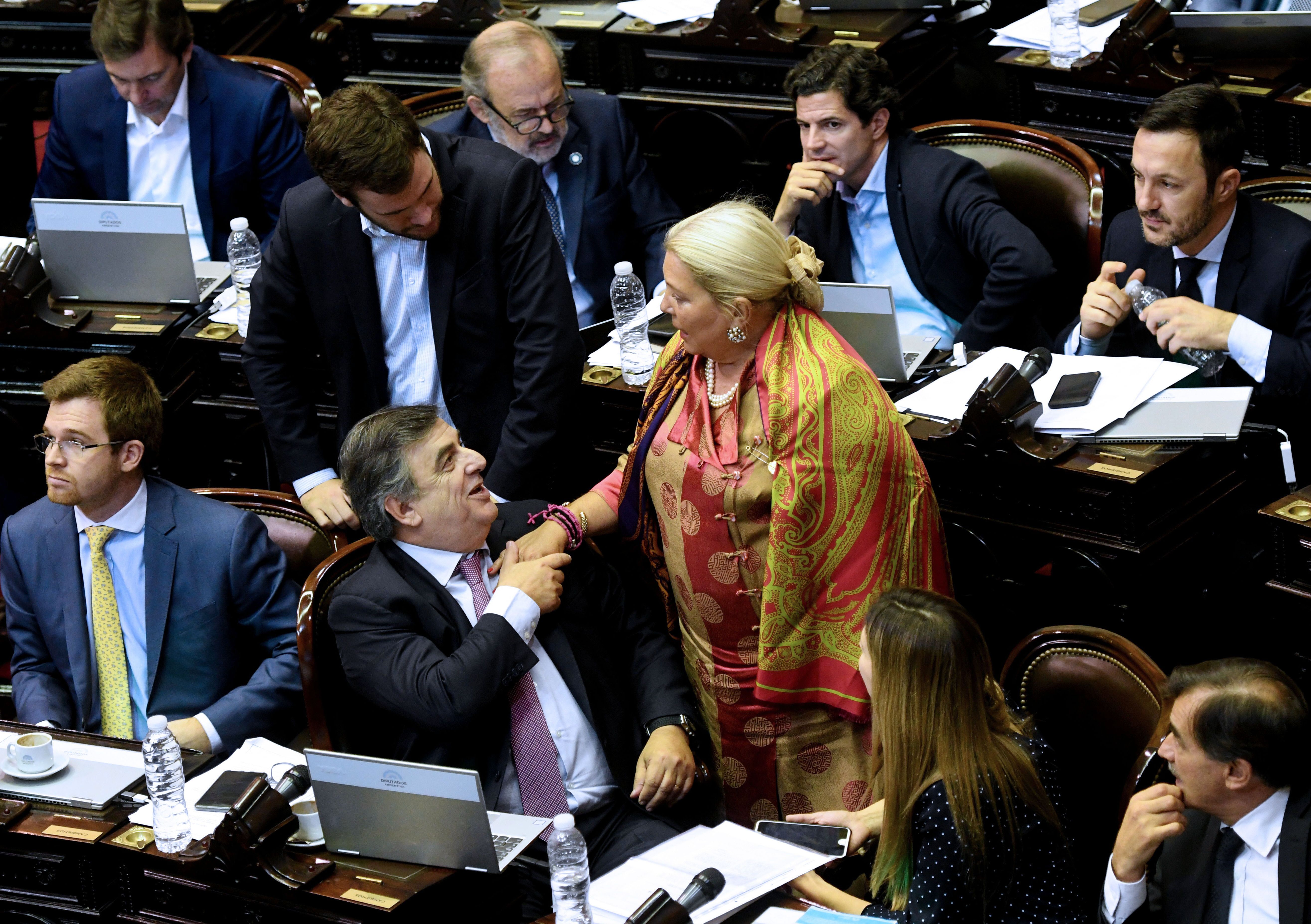 Oficialistas. El saludo de los diputados oficialistas Elisa Carrió y Mario Negri en la Cámara Baja, que ayer aprobó la ley sobre mercado de capitales.