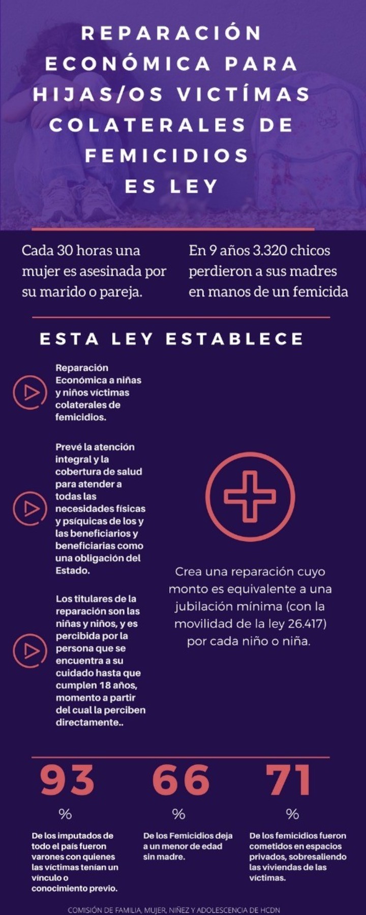 Lo que plantea la ley es una reparación, equivalente a una jubilación mínima, que ronda los 8.000 pesos. Pueden cobrarlo las niñas, niños, adolescentes o jóvenes cuyo padre haya sido procesado o condenado como autor, coautor, instigador o cómplice del delito de femicidio contra su madre. La reparación es hasta que cumplan 21 años, y en el caso de tener alguna discapacidad, es de por vida.