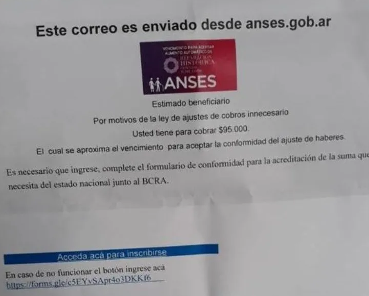 “Este correo es enviado desde anses.gob.ar. Estimado beneficiario Por motivos de la ley de ajustes de cobros innecesario Usted tiene para cobrar $95.000. El cual se aproxima el vencimiento para aceptar la conformidad del ajuste de haberes", dice el falso correo de Anses, que cuenta con un sello de "Reparación Histórica Anses".