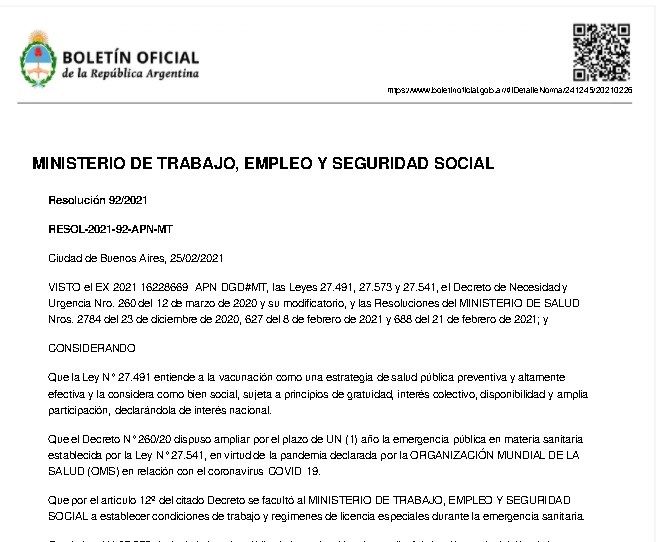 "La constancia de la aplicación de la vacuna, previa autorización del empleador, constituirá justificación suficiente, tanto para el vacunado como para los responsables de personas a su cargo", se agrega en el artículo segundo de la publicación oficial.