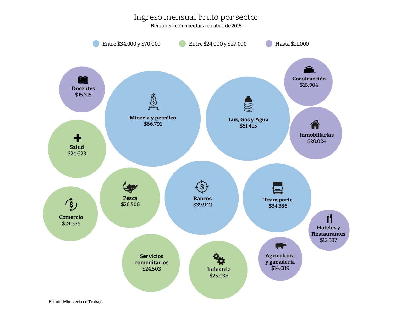 En contrapartida, los trabajadores que menos ganan son los que se desempeñan en hoteles y restaurantes, donde el ingreso es de $12.337, y agricultura, ganadería, caza y silvicultura, que se encuentra en $14.089. Luego están los trabajadores de enseñanza, cuyo sueldo promedio es de $15.315.
