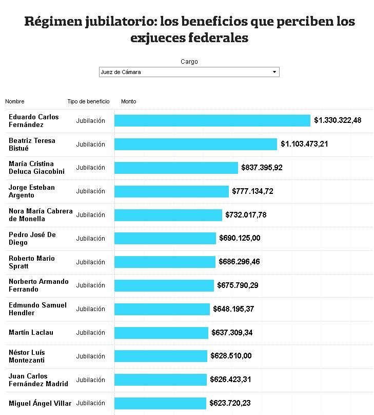 De la información correspondiente a mayo de 2020, surge que hay 14 exjueces de la Cámara de Casación (el mayor tribunal penal del país) que perciben entre $330.000 y $634.000 netos; 414 exmagistrados de Cámara (o sus herederos) cuyas asignaciones se ubican entre los $105.000 y los $837.000 netos y 378 exjueces de instrucción cuyas jubilaciones o pensiones en manos de familiares parten de los $67.000 y llegan hasta los $667.000, hechos los descuentos.