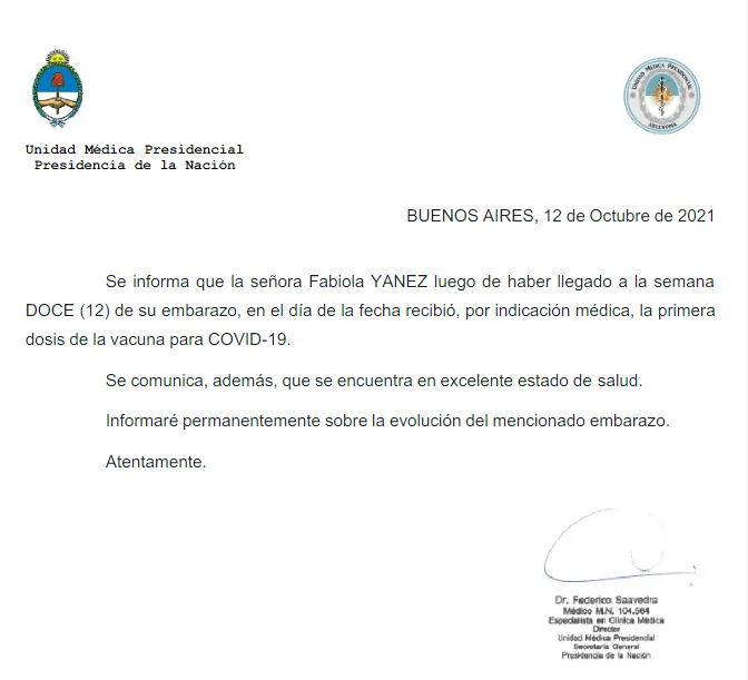El 23 del mes pasado el Gobierno nacional había confirmado el embarazo de Yáñez, también a través del mismo médico.