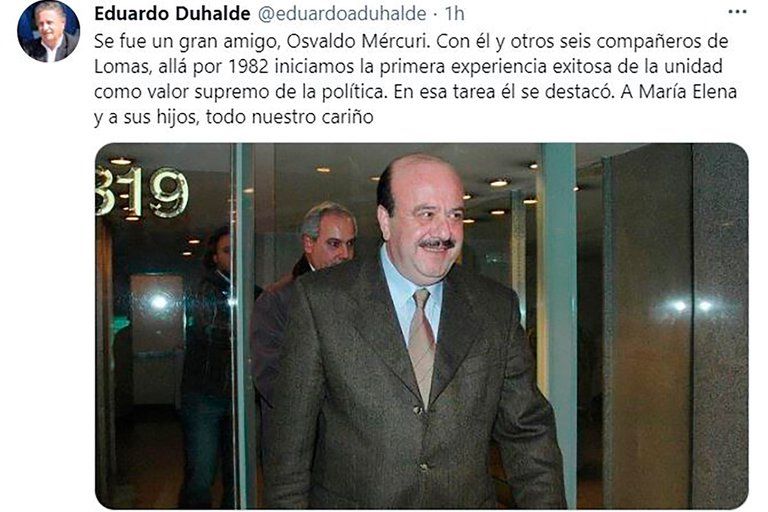 El apellido Mércuri estuvo también muy relacionado al del ex presidente Eduardo Duhalde de quien siempre fue un estrecho colaborador. En Twitter, Duhalde compartió una foto suya y redactó: “Se fue un gran amigo, Osvaldo Mércuri. Con él y otros seis compañeros de Lomas, allá por 1982 iniciamos la primera experiencia exitosa de la unidad como valor supremo de la política. En esa tarea él se destacó. A María Elena y a sus hijos, todo nuestro cariño”.