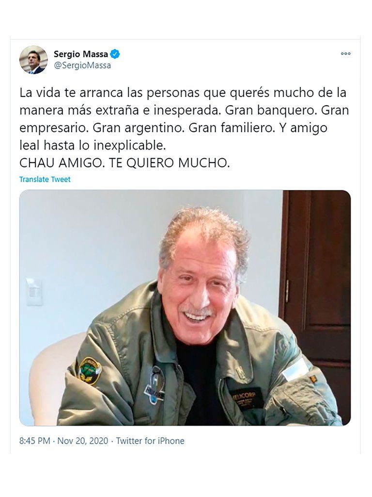 “Gran banquero. Gran empresario. Gran argentino. Gran familiero. Y amigo leal hasta lo inexplicable. CHAU AMIGO. TE QUIERO MUCHO”, escribió Massa en su cuenta de Twitter.