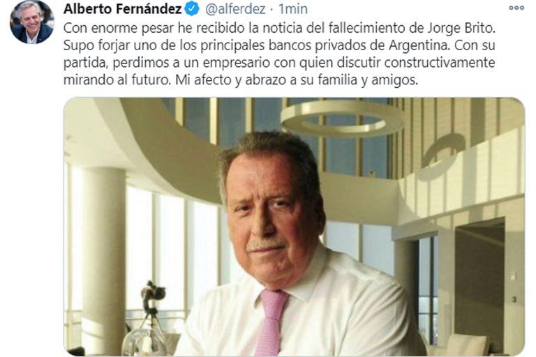 “Con su partida, perdimos a un empresario con quien discutir constructivamente mirando al futuro”, escribió Fernández, quien también envió un abrazo a todos sus familiares y amigos.