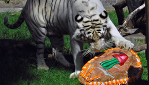 Las elefantas son homenajeadas con huevos rellenos de manzanas deliciosas, zanahorias, pan de zapallos y miel. En tanto, los tigres recibieron varios huevos con carne picada, trozada y hueso con carne.