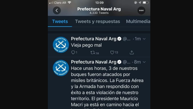 Con un relato hasta inclusive peligroso, los hackers se apropiaron de la cuenta de la Prefectura: "Vieja pegó mal", señalaba al mediodía un tuit de la fuerza que conduce la ministra de Seguridad, Patricia Bullrich, cuyo vocero confirmó a este diario el hackeo. Pasadas las 13.40, afirmaban en el Ministerio que el robo de la cuenta "ya estaba solucionado".