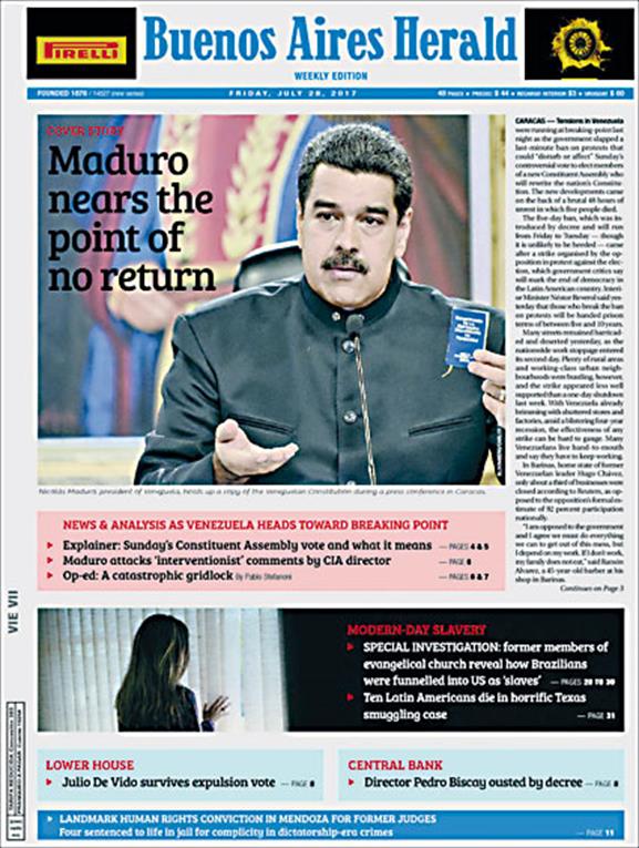 En su última edición, incluyó la cobertura de la asamblea constituyente que se realizó anteayer en Venezuela. Julio de Vido también quedará en la última página de la historia de este medio, ya que se publicó una nota sobre cómo sobrevivió al intento de ser expulsado del Congreso. Y una nota en la que se analizaban las perspectivas de las próximas elecciones legislativas en la Argentina. A principios de este mes, el Grupo Indalo, que tiene otros medios como C5N y Radio 10, cerró el canal de noticias CN23.