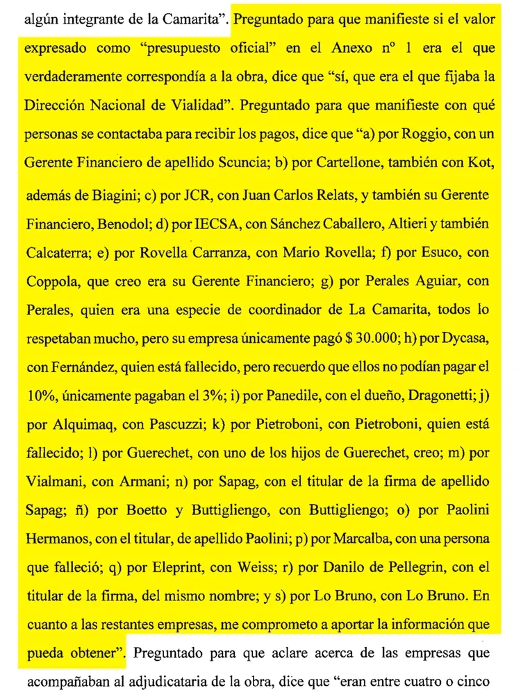 Cuando le preguntaron de dónde habían surgido los listados de las empresas de obra pública y sus pagos, Clarens dijo que "sé que circulaba en la Camarita, nunca supe quién lo confeccionaba, creo recordar que alguna vez, Perales -en referencia a Perales Aguiar- me pudo haber acercado estos listados. De todos modos, todos los integrantes de la Camarita contaban con estos listados y se valían de los mismos para lograr que le fueran otorgadas obras. En cuanto a las firmas o personas que integraban La Camarita, debo indicar que la totalidad de las empresas que figuran en el ránking eran quienes compraban los pliegos de las obras, pero reitero que las primeras 40 empresas eran las que definían, mayoritariamente, las asignaciones". Clarens se refirió a Rodolfo Perales, presidente de la Cámara Argentina de Empresas Viales, conocida como "La Camarita" para diferenciarla de la Cámara Argentina de la Construcción (CAC).