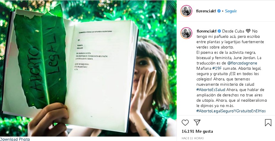 En Instagram, la hija de Cristina Kirchner compartió una foto de un texto de June Jordan, una activista estaounidense que falleció en 2002. Junto a la imagen del libro ubicó una planta con la inscripción " Aborto legal!". "Desde Cuba. No tengo mi pañuelo acá, pero escribo entre plantas y lagartijas fuertemente verdes sobre aborto", comenzó su mensaje.