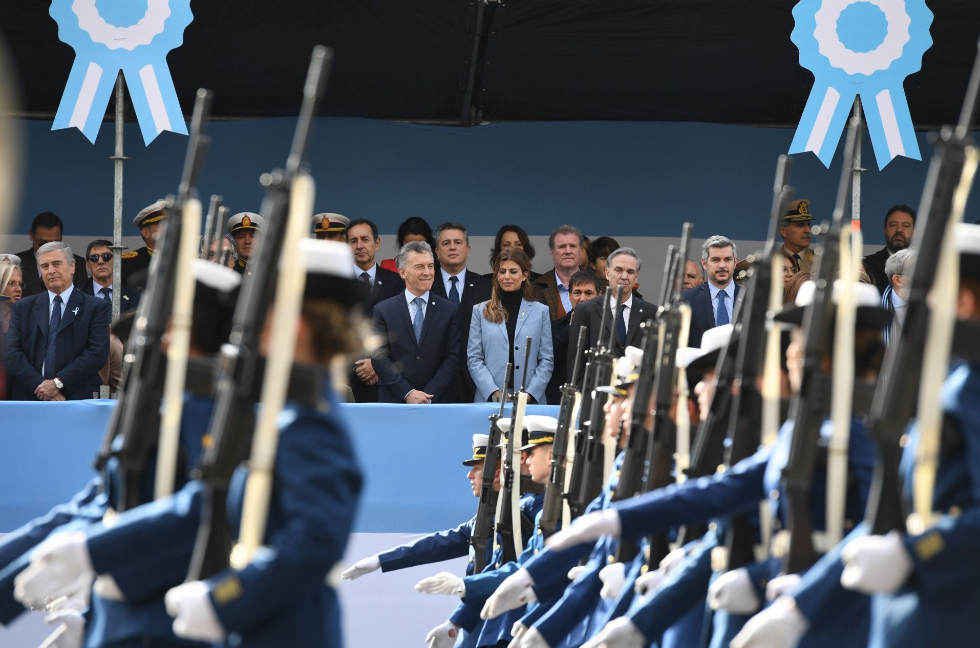 En celeste y blanco. Macri presidió el acto central por el Día de la Independencia en la histórica Casa de Tucumán. Luego presenció el desfile militar en Palermo (foto) junto a su esposa, Miguel Pichetto y todo su Gabinete de ministros.