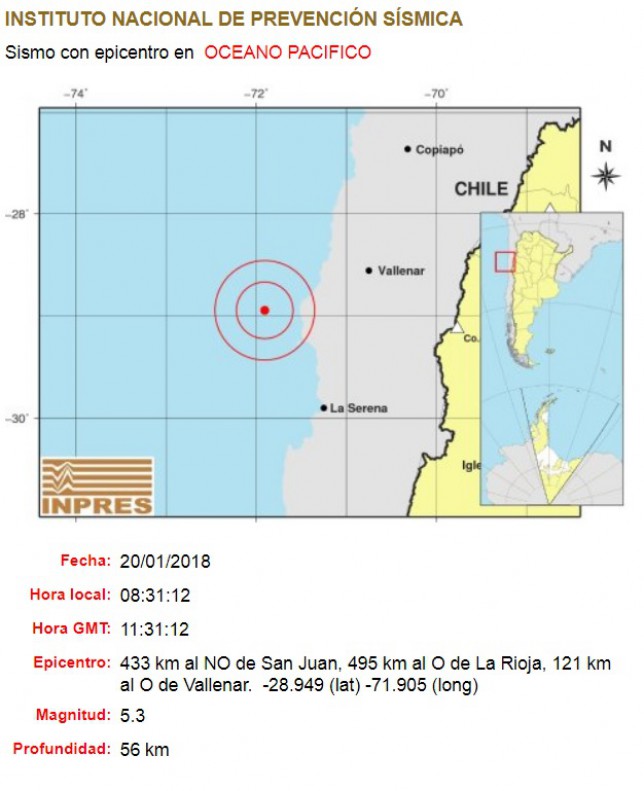De acuerdo con la información publicada por el Instituto Nacional de Prevención Sísmica, el temblor se produjo a las 8:31:12 y el epicentro se ubicó a 433 kilómetros al noroeste de San Juan, a 495 kilómetros al oeste de La Rioja y a 121 kilómetros al oeste de Vallenar.