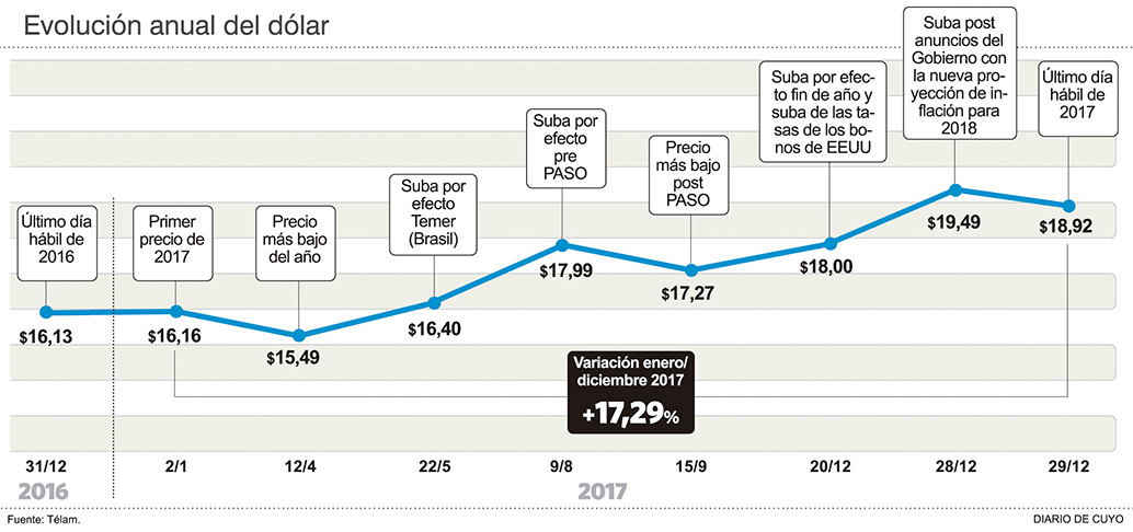 Este nivel fue impulsado primero por razones domésticas como es el cierre de balances, compra de dólar turista, demanda de dólares por pago de aguinaldo y por razones externas como fue la suba de las tasas de los bonos del Tesoro de los Estados Unidos. La tendencia alcista se potenció ayer tras los anuncios del equipo económico entre los que se definió una inflación anual para el 2018 de 15 por ciento, lo que generó que el dólar alcanzara los 19,46 para la venta al público, su máximo histórico.