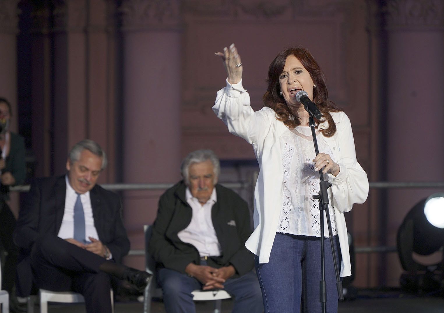 La vicepresidenta Cristina Fernández de Kirchner aprovechó un escenario inmejorable, a plaza llena por los 38 años ininterrupidos de democracia, para blanquear sin tapujos su posición frente a las negociaciones con el FMI: después de acusar al Fondo de "vivir condicionando a la democracia argentina" y llevarse puesto a dos presidentes (en referencia a Raúl Alfonsín y Fernando De la Rúa), la vicepresidenta pidió "no firmar ningún plan que no permita la recuperación económica". Convocó a todos los argentinos a salir a la calle a defender sus derechos y usar todos los dólares que están fuera del país para pagar la deuda. Minutos después, cuando le tocó cerrar los discursos, Alberto Fernández le respondió: "Tranquila, no tengas miedo, yo no te voy a soltar la mano".