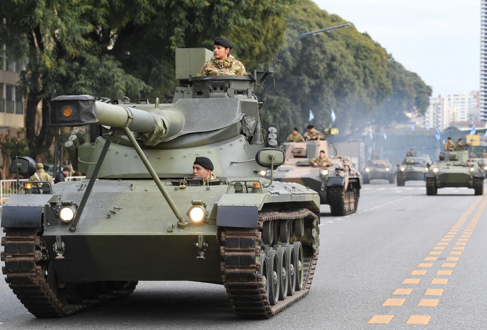 Luego, llegó el turno de los vehículos de combate: "De un tiro, ese tanque te saca de la faz de la tierra", dijo Ignacio, de 12 años, a su hermano menor, al ver uno de los modelos del Tanque Argentino Mediano (TAM) de la Armada, que con sus dos toneladas y media de peso hizo vibrar el asfalto de la avenida mientras avanzaba.