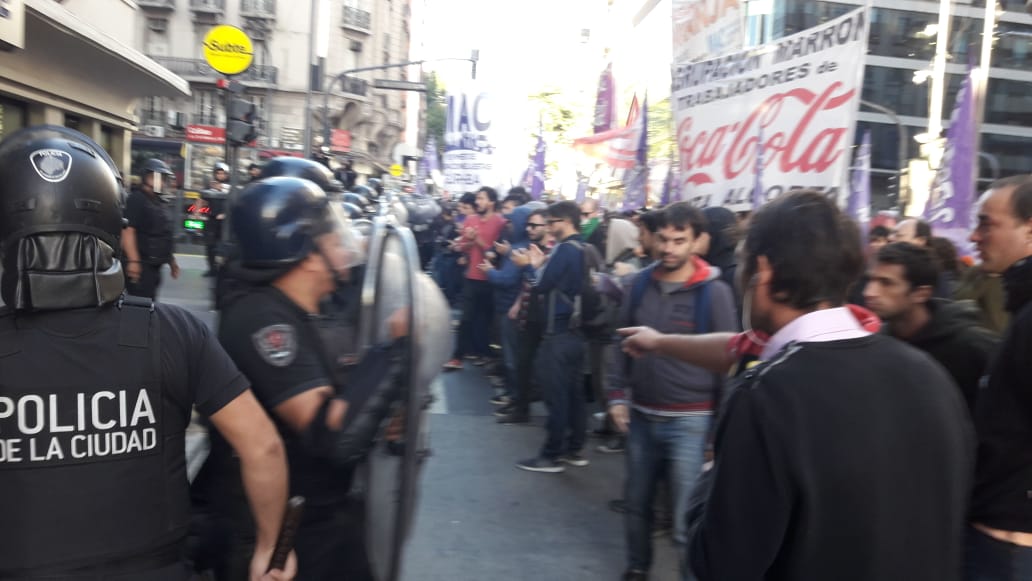 Los enfrentamientos se iniciaron a las 7:30, cuando los activistas se desplazaron sobre la avenida Corrientes para interrumpir el tránsito. La Policía de la Ciudad, que se encontraba en el lugar, montó una formación y avanzó para liberar el tránsito.