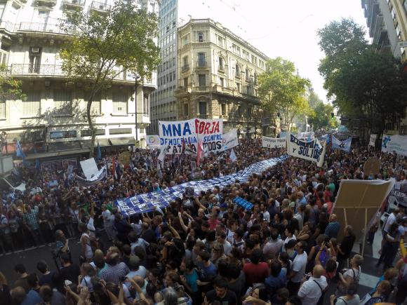 La columna llegó a la Plaza encabezada por referentes de Madres y Abuelas de Plaza de Mayo y de H.I.J.O.S., que partieron de la Avenida de Mayo a la altura de la calle Piedras, seguidos por miles de manifestantes que confluyeron desde el Obelisco y el Congreso.