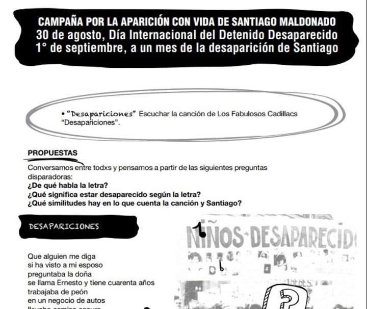 Para Primaria, por ejemplo, la indicación pedagógica comienza por escuchar con los chicos la canción "Desapariciones" de Los Fabulosos Cadillacs. Luego propone: "Conversamos entre todxs y pensamos a partir de las siguientes preguntas disparadoras: ¿De qué habla la letra? ¿Qué significa estar desaparecido según la letra? ¿Qué similitudes hay en lo que cuenta la canción y Santiago?".