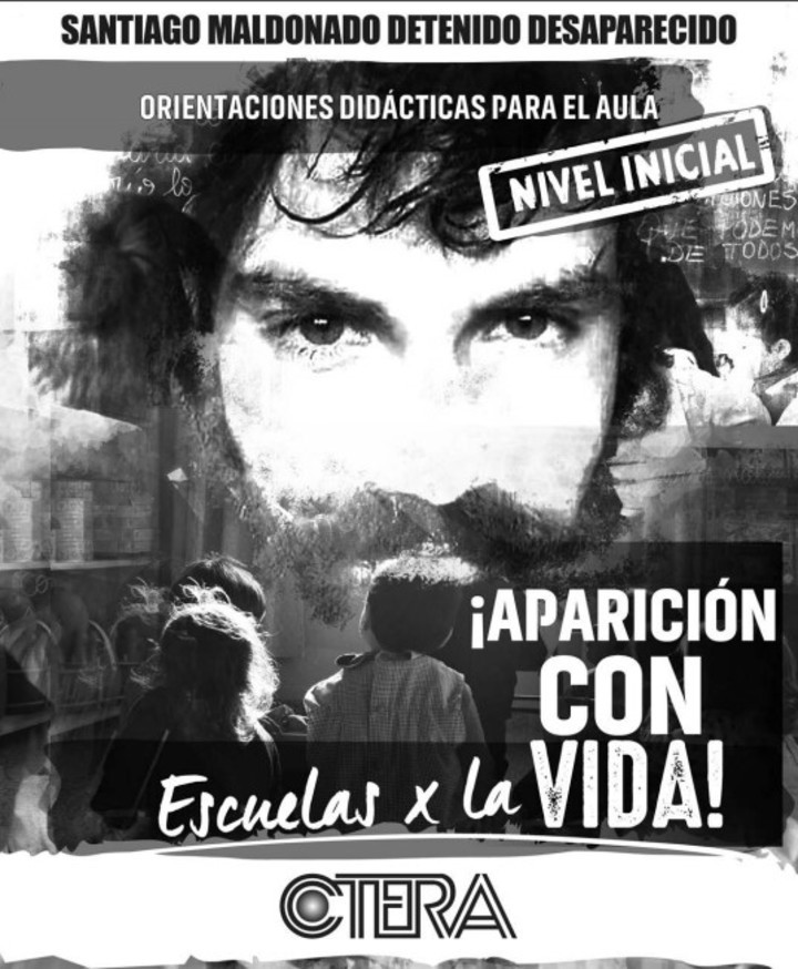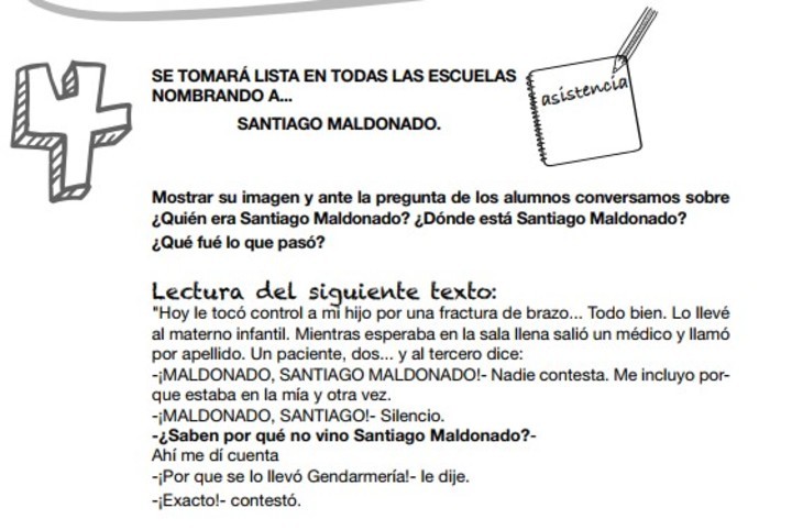El caso de Santiago Maldonado será tema de estudio y reflexión en los próximos días en escuelas de todo el país. Así lo pretenden al menos los principales gremios docentes del país, que comenzaron a distribuir entre sus afiliados polémicos materiales didácticos donde proponen hablar del joven como un "detenido desaparecido" a quien "se lo llevó la Gendarmería", pese a que eso aún está siendo investigado.