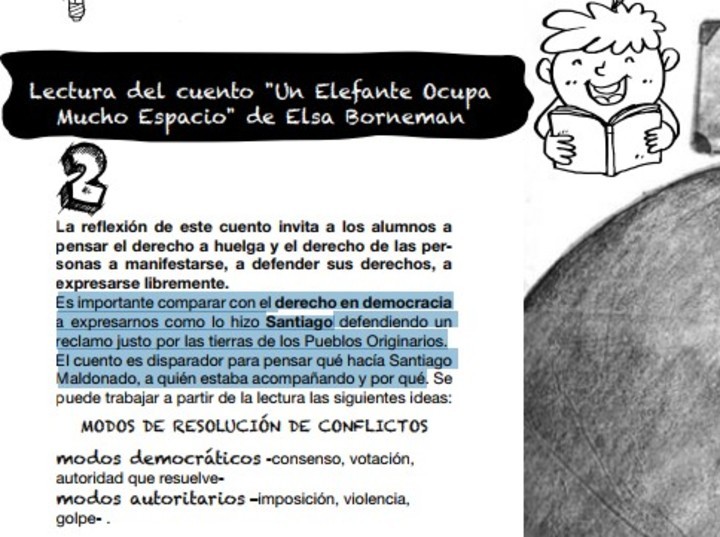 A los chicos del nivel inicial también se les hablará de Maldonado. Para ellos, la indicación del gremio es, entre otras actividades, leerles el cuento "Un elefante ocupa mucho espacio" de Elsa Borneman. "Es importante comparar con el derecho en democracia a expresarnos como lo hizo Santiago defendiendo un reclamo justo por las tierras de los Pueblos Originarios. El cuento es disparador para pensar qué hacía Santiago Maldonado, a quién estaba acompañando y por qué", sugieren los sindicatos.