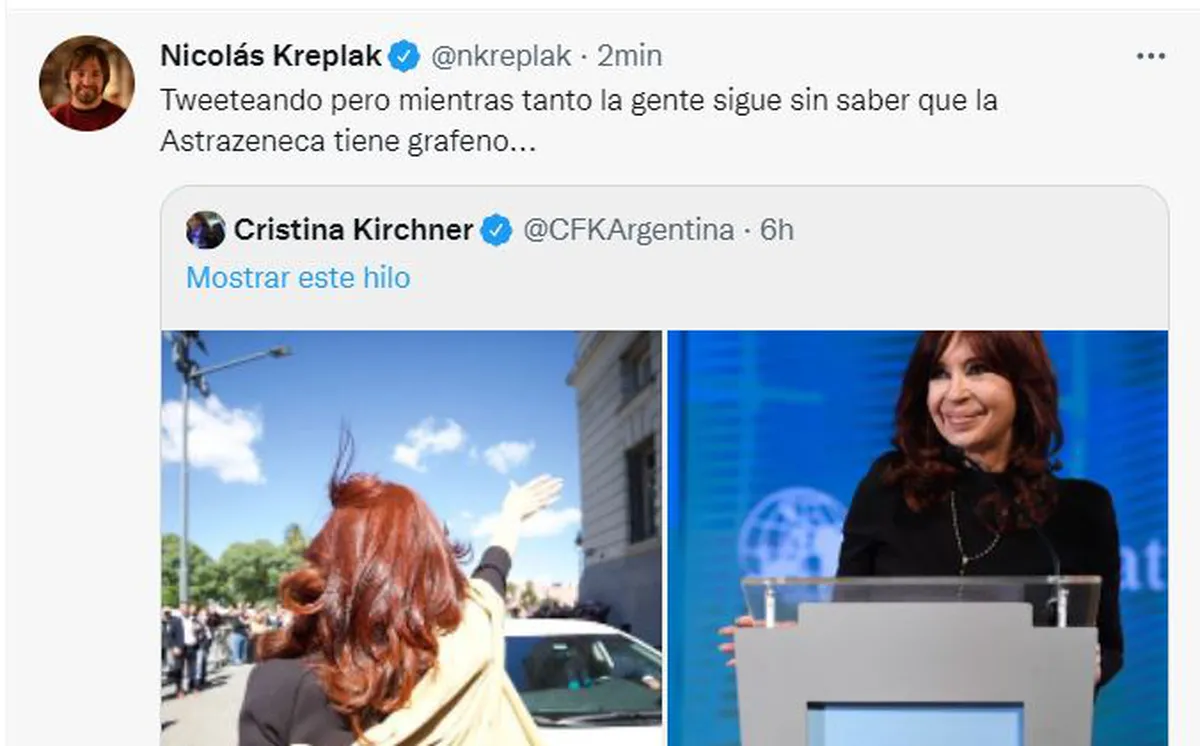 En otro mensaje, escribieron en respuesta a un mensaje de Cristina Kirchner. “Twiteando, pero mientras tanto la gente sigue sin saber que la AstraZeneca tiene grafeno”.