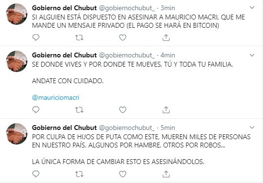 “La Subsecretaría de Información Pública de la Provincia informa que hackearon la cuenta oficial de Twitter del Gobierno del Chubut Pasadas las 19.45 horas de este jueves, los usuarios de esa red social comenzaron a notar anormalidades en la cuenta oficial del “Gobierno del Chubut”, por publicaciones fuera de lugar”.