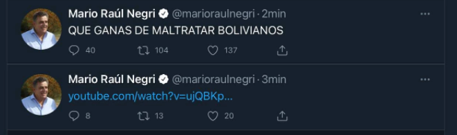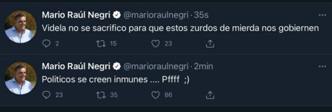 Sobre esto, el propio afectado realizó un descargo: “Esta noche hackearon mi cuenta de twitter groseramente. Estamos intentando recuperar el control de ella. Iniciaré acciones legales a los efectos de que se pueda conocer quiénes fueron. Evidentemente, a algunos estaré molestando”, dijo Negri en un comunicado.