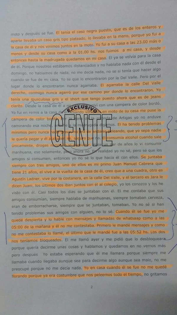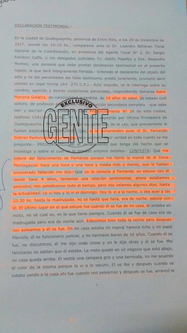 Ese mismo día a las 10:10 de la mañana declaró por primera vez ante el fiscal. Confesó que habían estado juntos la noche anterior y que habían discutido, pero aclaró que no era su novia y que se enteró de la muerte de Fernando porque lo llamó la madre de él para contarle lo que había pasado.