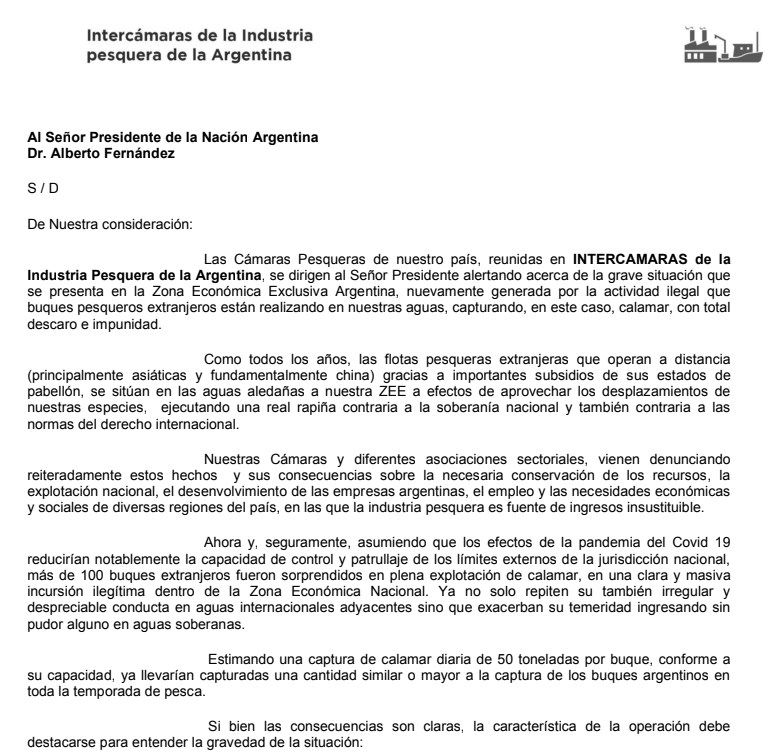 Lo hacen, explicó, apagando el AIS (Automatic Identification System) de modo que los satélites no los detecten. Sucede además que, como dice la nota que la Intercámara Pesquera le envió al presidente, “seguramente, asumiendo que los efectos de la pandemia del Covid 19 reducirían notablemente la capacidad de control y patrullaje de los límites externos de la jurisdicción nacional, más de 100 buques extranjeros fueron sorprendidos en plena explotación de calamar, en una clara y masiva incursión ilegítima dentro de la Zona Económica Nacional". Y agrega, "Ya no solo repiten su también irregular y despreciable conducta en aguas internacionales adyacentes sino que exacerban su temeridad ingresando sin pudor alguno en aguas soberanas”.