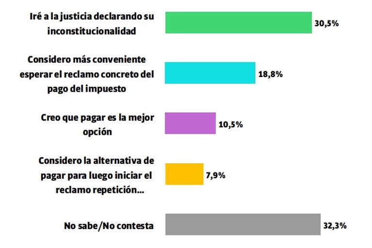 Además, un 18.8% consideró más conveniente esperar el reclamos concreto del pago del impuesto, mientras que el 10,5% cree que pagar es la mejor opción , un 7,9% evaluó la alternativa de pagar para luego iniciar el reclamo y un 32,3% dijo que no sabe o no contestó.