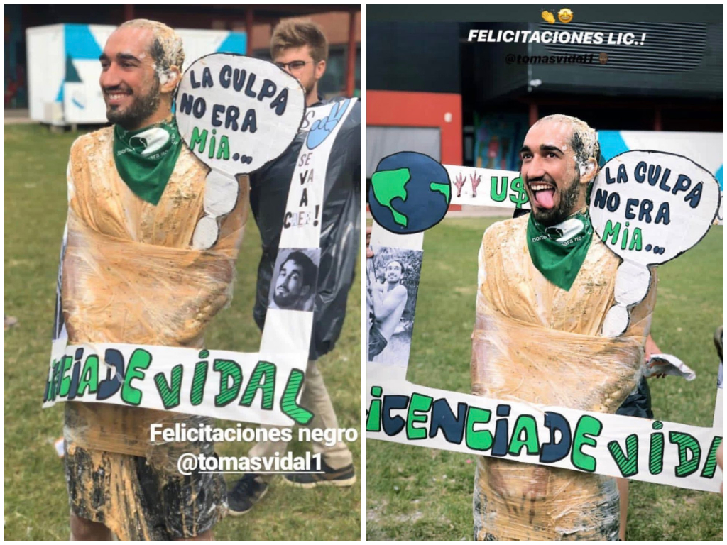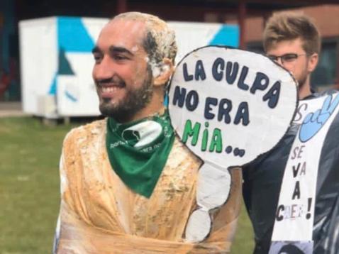 Envuelto en plástico, con una soga en el cuello y un pañuelo verde identificado con el colectivo que reclama la legalización del aborto, Vidal intentó simular que era un cadáver. Además, en las fotos se ve que el joven también llevaba un cartel en el que se leía “la culpa no era mía”.