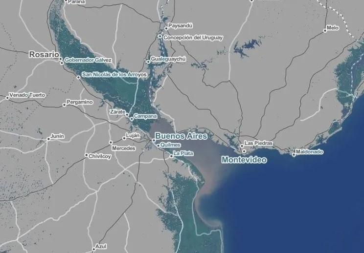 En el caso de que se produzca un aumento de la temperatura global de 2 grados, las aguas cubrirían parte de los territorios bonaerense y entrerrianos y así aumentarían hasta los casi 5 metros.