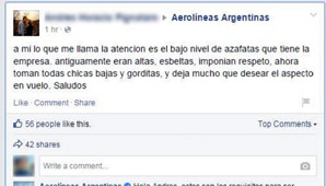 Buenos Aires, 23 de enero.-"A mí lo que me llama la atención es el bajo nivel de azafatas que tiene la empresa. Antiguamente eran altas, esbeltas, imponían respeto. Ahora toman todas chicas bajas y gorditas y deja mucho que desear el aspecto en vuelo", dijo el usuario de la red social.