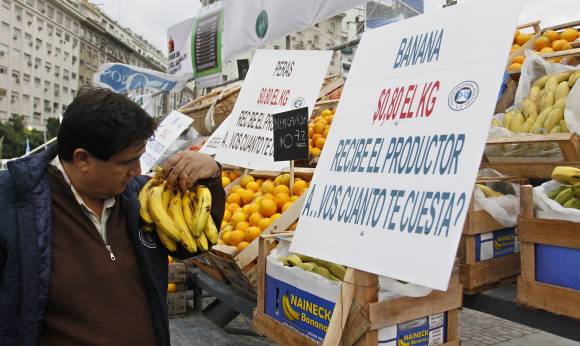 En tanto, en lo que tuvo que ver con la protesta, los productores instalaron stands y camiones con distintos tipos de productos, con carteles en los que figuraban los precios que recibían por la venta a granel a los intermediarios. Entre los valores exhibidos figuran que por manzanas, peras y bananas reciben alrededor de 80 centavos de peso el kilo; la naranja, a 72 centavos; y el tomate, a 1,50 pesos.