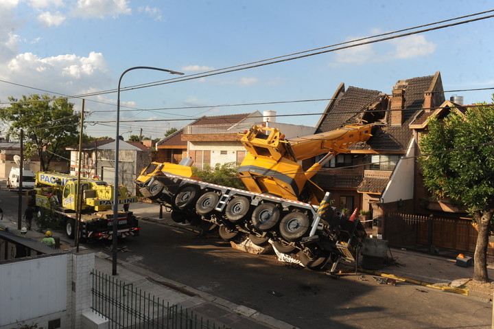 Sin embargo, por causas que se investigan, la grúa se desbalanceó e impactó contra el techo. El vehículo quedó de costado sobre dos volquetes que impidieron su vuelco completo, lo que hubiese ocasionado un daño mayor.